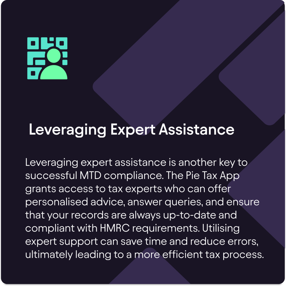 The Pie Tax App facilitates digital record-keeping, offers real-time tax monitoring, and provides access to expert tax assistants who can provide personalised advice and support for a seamless MTD transition.